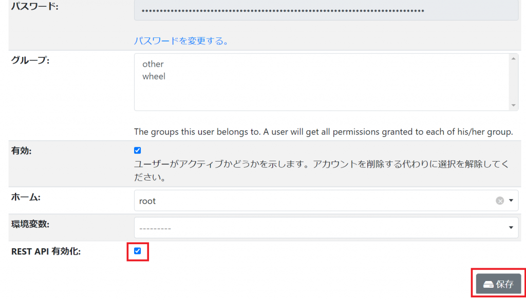 画面右上の root > ユーザー情報からユーザー情報画面に移動して、画面右の「編集」ボタンをクリックしてください。その後画面下の「REST API有効化」にチェックを入れて、「保存」ボタンをクリックしてください。