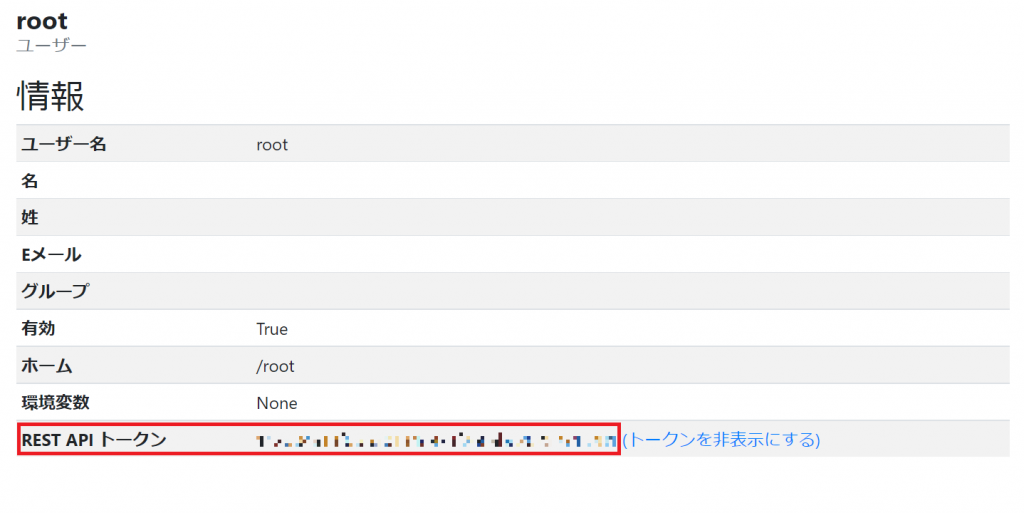 ユーザー情報画面の「REST APIトークン」欄の「トークンを表示する」をクリックして、表示されたトークン文字列を控えておいてください。