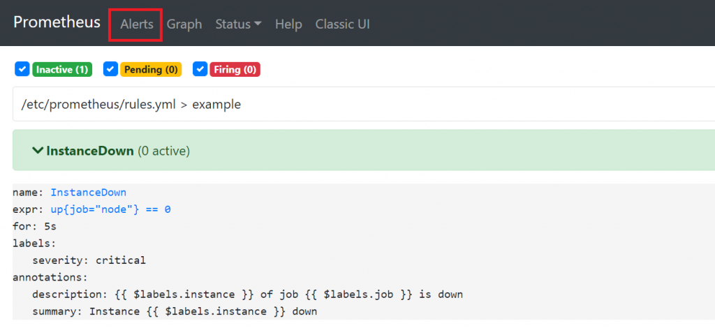 サーバーが正常時には以下のように Prometheus の Alerts は Inactive になっています。