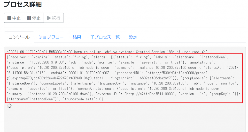 ここでは receiver を “kompira” と名付け、Prometheus から受け取った通知より Kompira Enterprise の API を呼び出します。