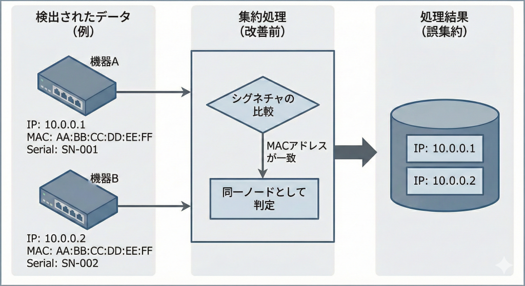 そういった環境において、これまでのノード集約処理では「シリアル番号は異なるが、MAC アドレスが同じ」というようなケースで異なる機器の IP アドレスが1つのノードとして集約されてしまっていました。