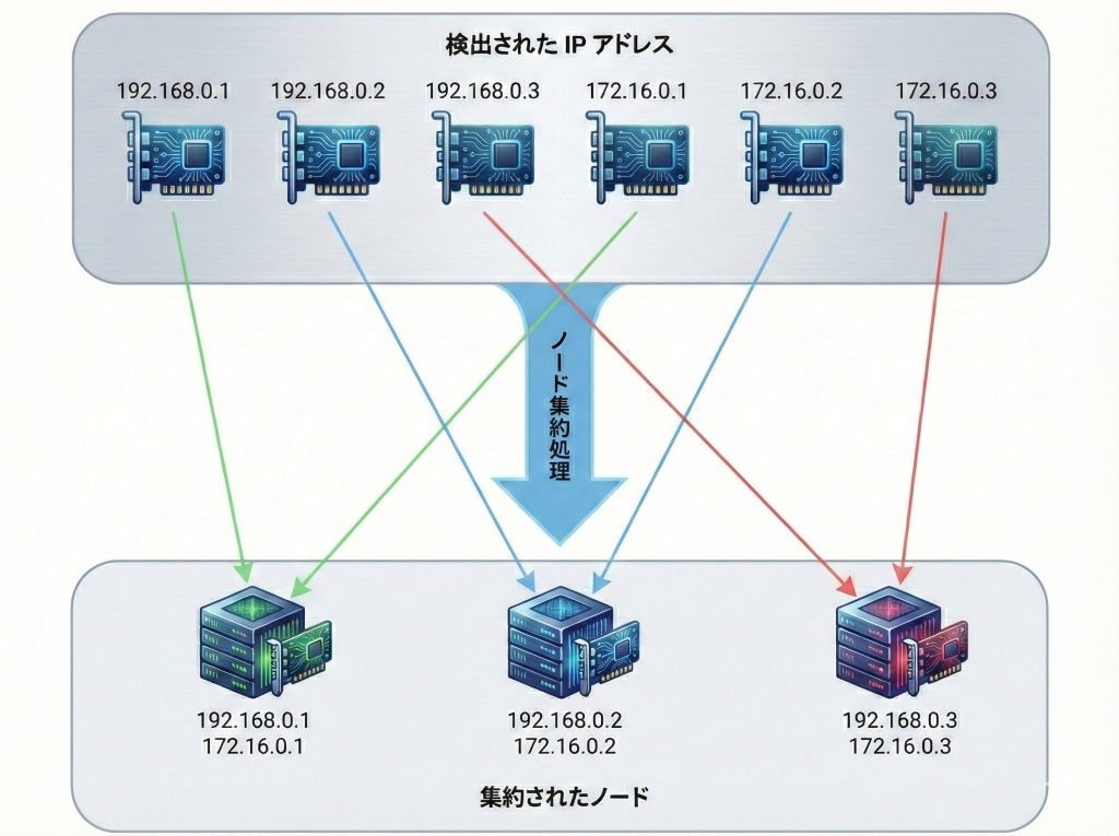 Sonar におけるノード集約とは、スキャン時に検出された多数の IP アドレスのうち、同じ機器やマシンだと判断された IP アドレスを1つのノードにまとめる(=集約)機能のことを指します。